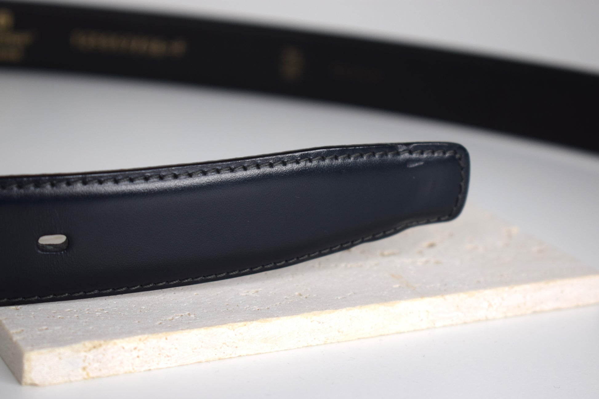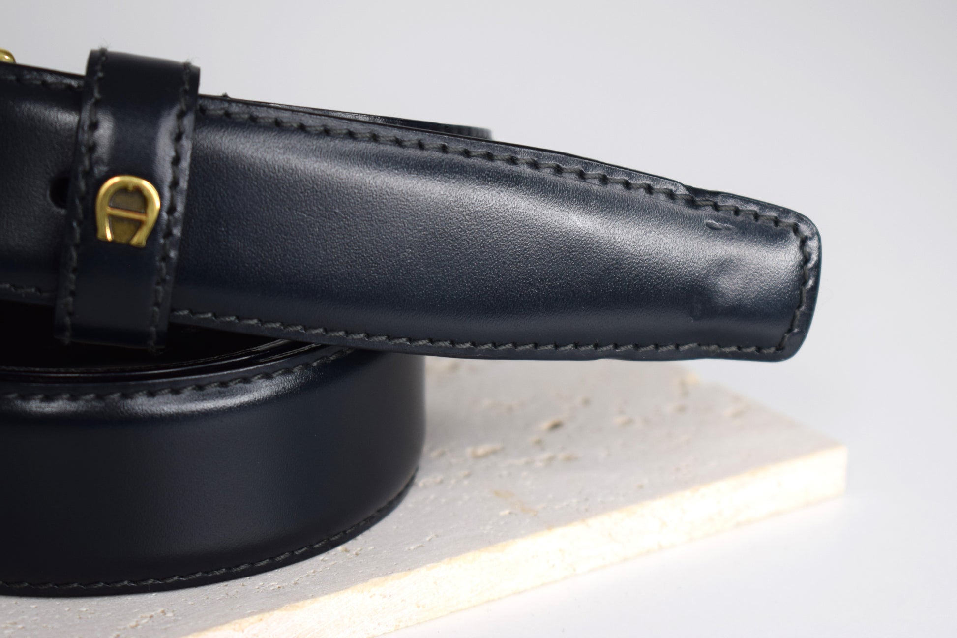 Genießen Sie die erstklassige Qualität und das unverwechselbare Design von Aigner mit diesem dunkelblauen Glattleder Gürtel. Holen Sie sich dieses stilvolle Stück und verleihen Sie Ihren Outfits eine Hauch von zeitloser Raffinesse und Exklusivität.