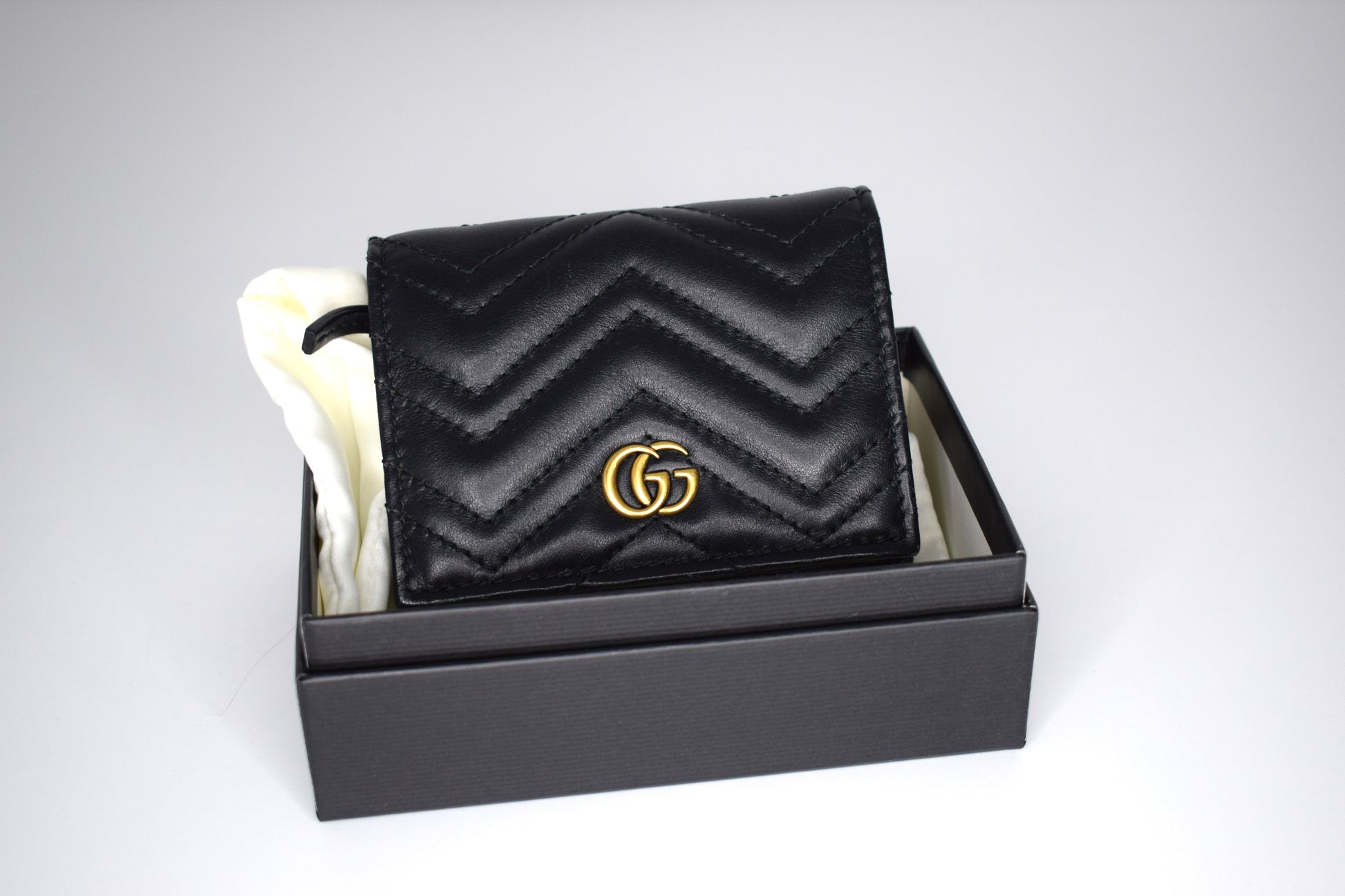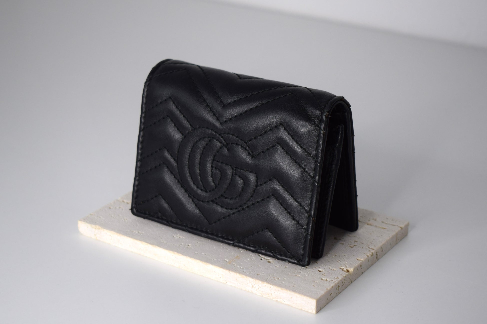 Beschreibung: Willkommen in der exquisiten Welt der "Marmont" Kollektion von Gucci. Tauchen Sie ein in Luxus und Stil mit unserer schwarzen Matelassé-Lederbrieftasche, die mit einem ansprechenden Chevron-Design und dem ikonischen GG-Logo auf Vorder- und Rückseite verziert ist.