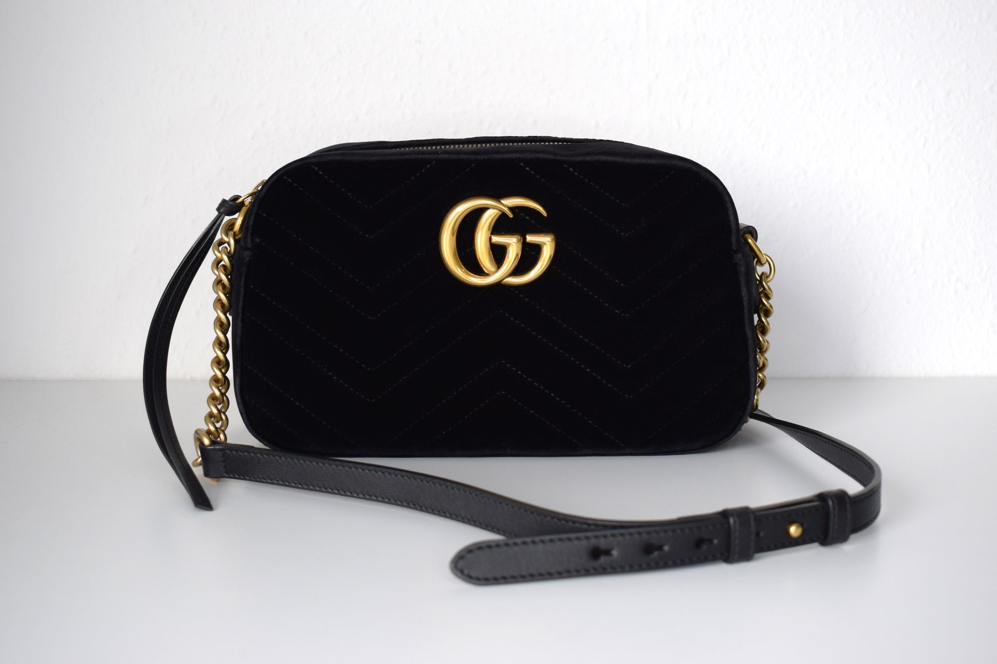 Das samtige Material verleiht der Tasche eine luxuriöse Textur und einen subtilen Glanz, der das Schwarz zum Strahlen bringt. Der verstellbare Schultergurt ermöglicht eine individuelle Anpassung und bietet höchsten Tragekomfort. Die goldenen Kettendetails setzen dabei nicht nur glanzvolle Akzente, sondern unterstreichen auch den ikonischen Charakter der Marmont Kollektion.