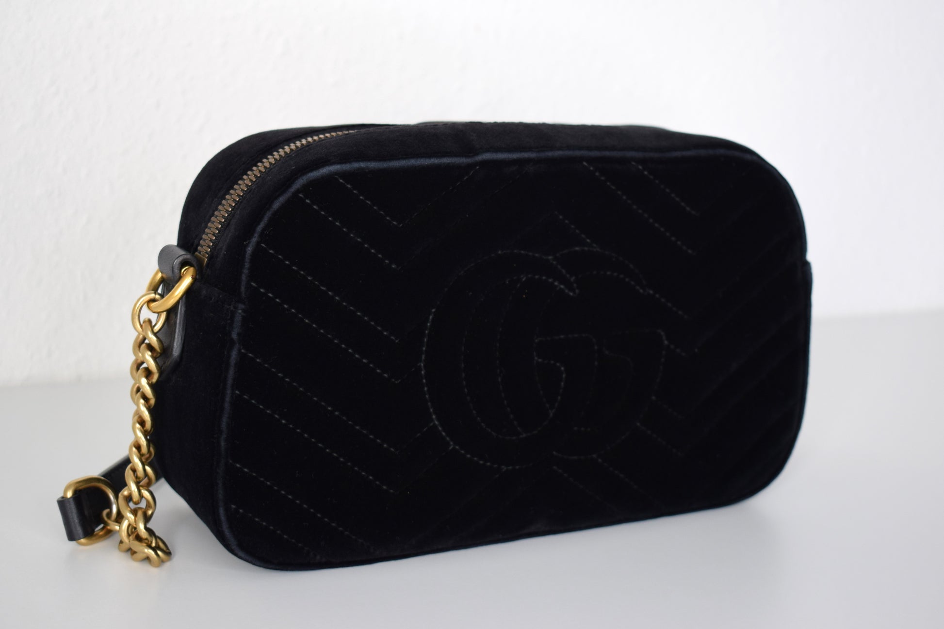 Gucci Marmont Samt Crossbody Bag in schwarz mit goldenen Elementen.