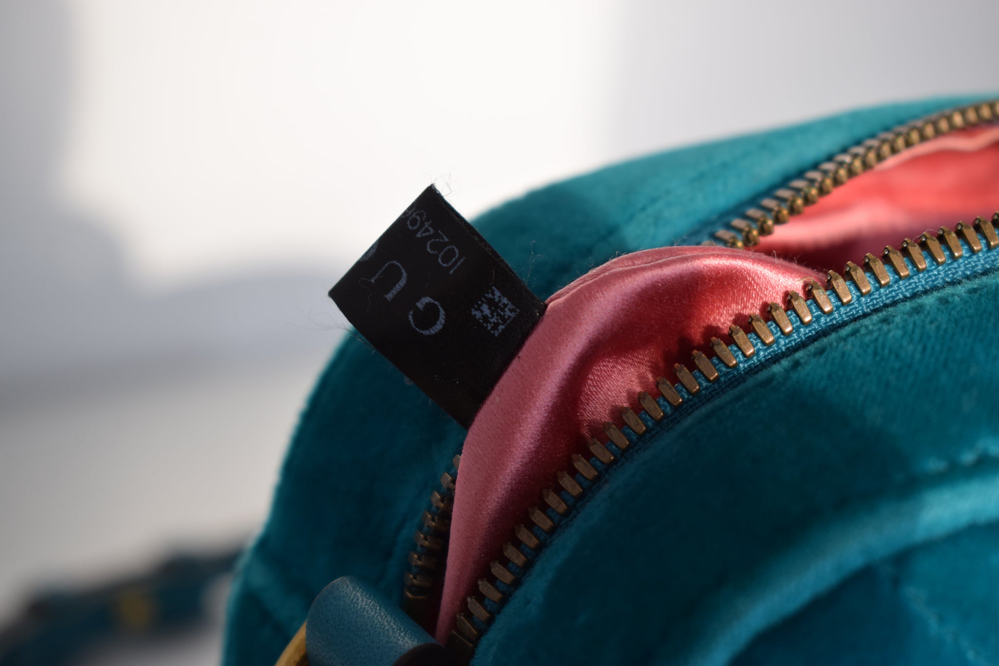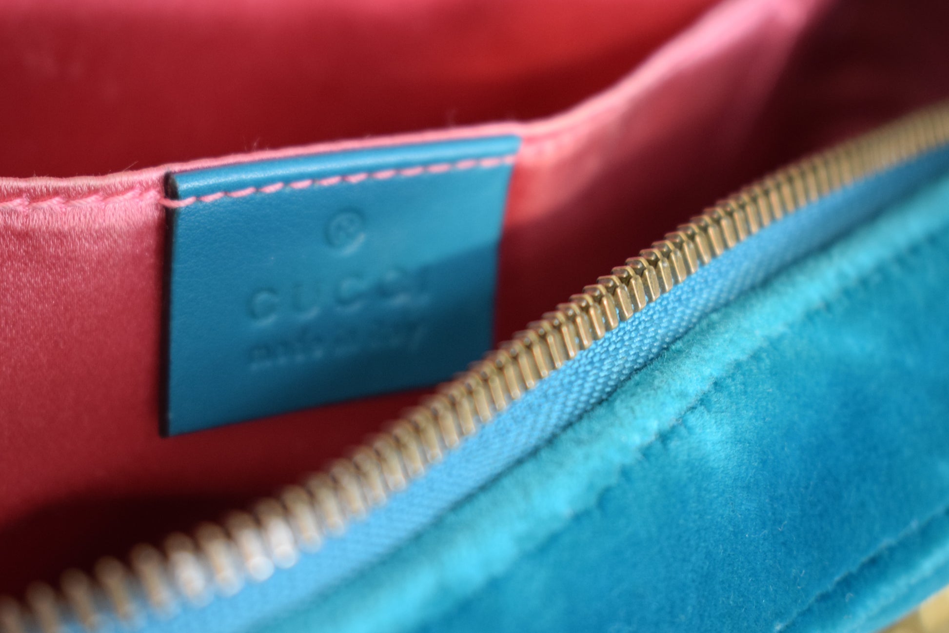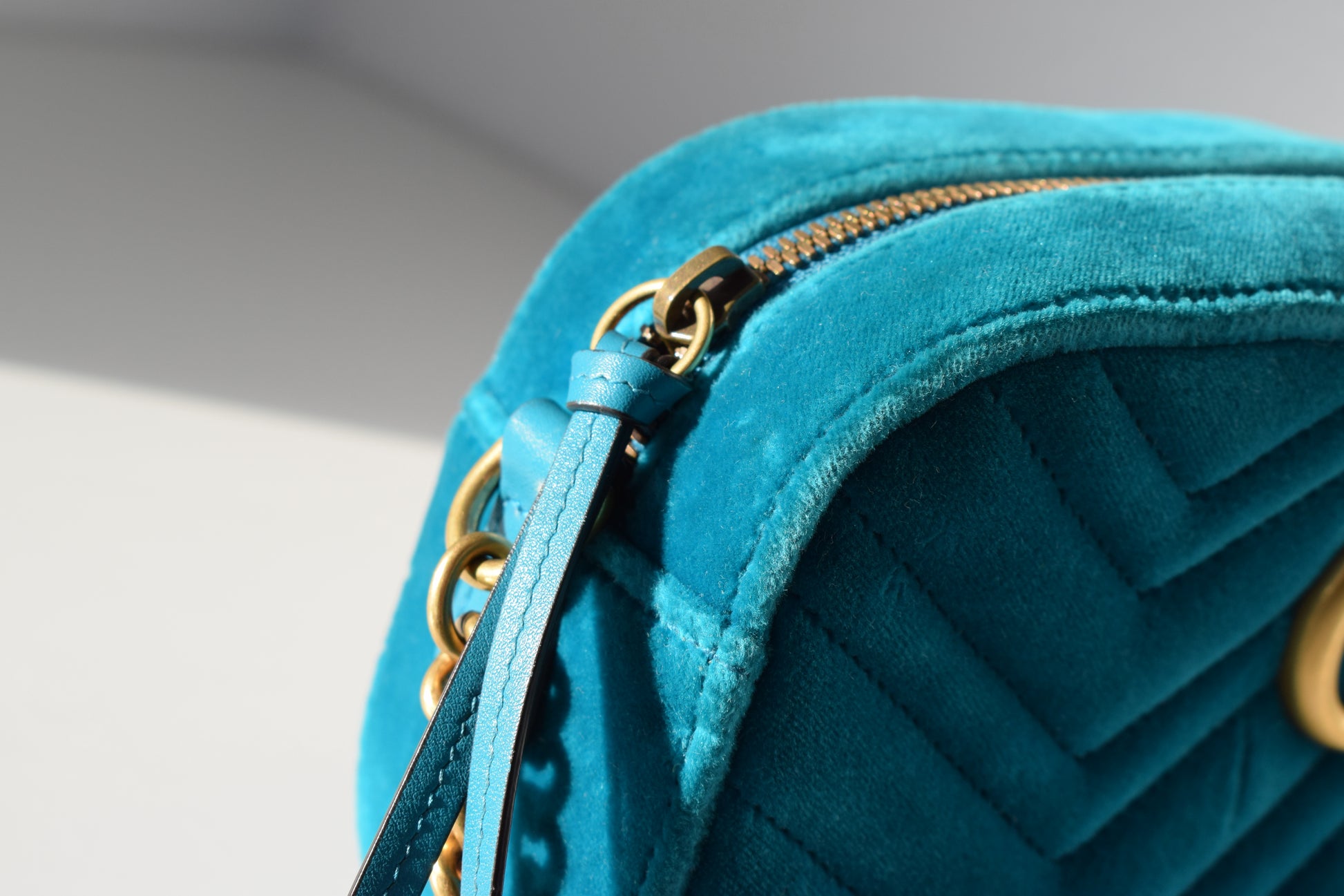 Gucci Marmont Samt Crossbody Bag in Türkis mit goldenen Elementen.